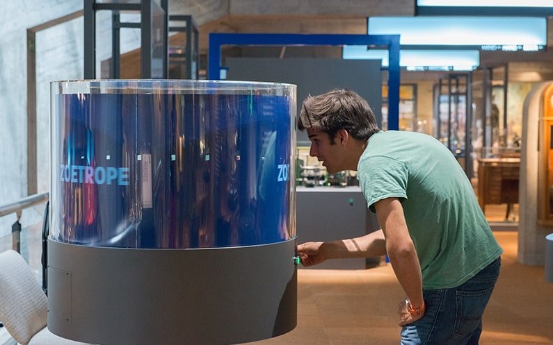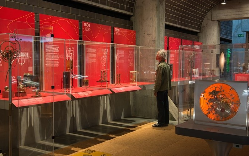 Conçu comme une frise chronologique parcourant le pourtour intérieur du musée, le fil rouge propose une histoire de la mesure du temps en 36 étapes. Suivez-le dans un sens ou dans l’autre pour découvrir les évolutions fondamentales de la mesure du temps, de sa technique, de son art et de son industrie, avant d’aborder les espaces thématiques.